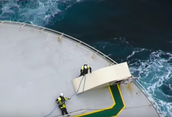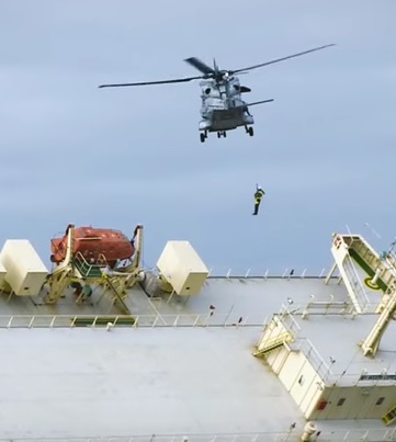 Un técnico de la empresa holandesa SMIT Salvage desciende al 'Modern Express' desde un helicóptero