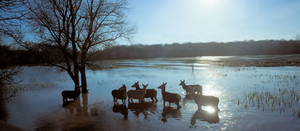 Regresamos al camino. Se abren las vistas al oeste y al norte y a los extensos prados húmedos (4) que se desarrollan entre la laguna y el camino, donde los ciervos pastan a sus anchas.
