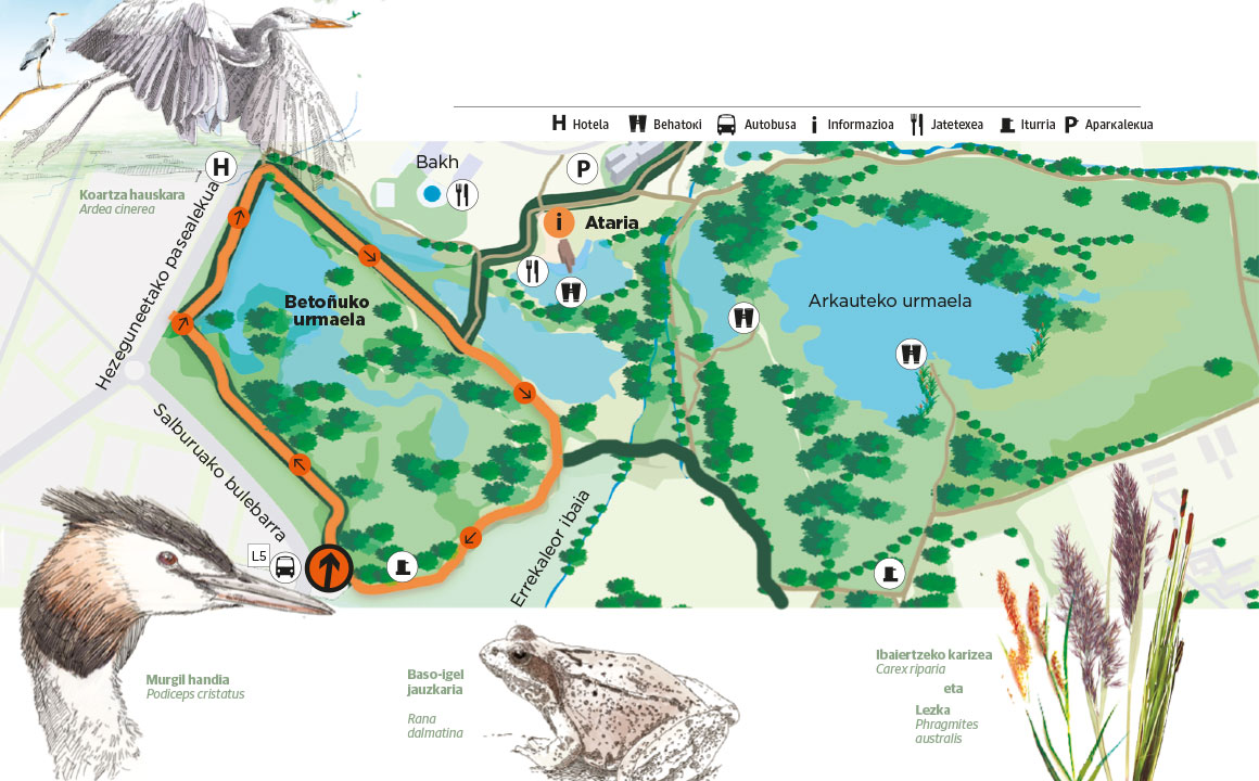 Ur gaineko zurezko pasagunea zeharkatu ondoren, Hezeguneen ibilbidera iritsiko gara, eta bideak eskumarantz egingo du. Zenbait metroz paralelo jarraituko dugu kale horrekiko.