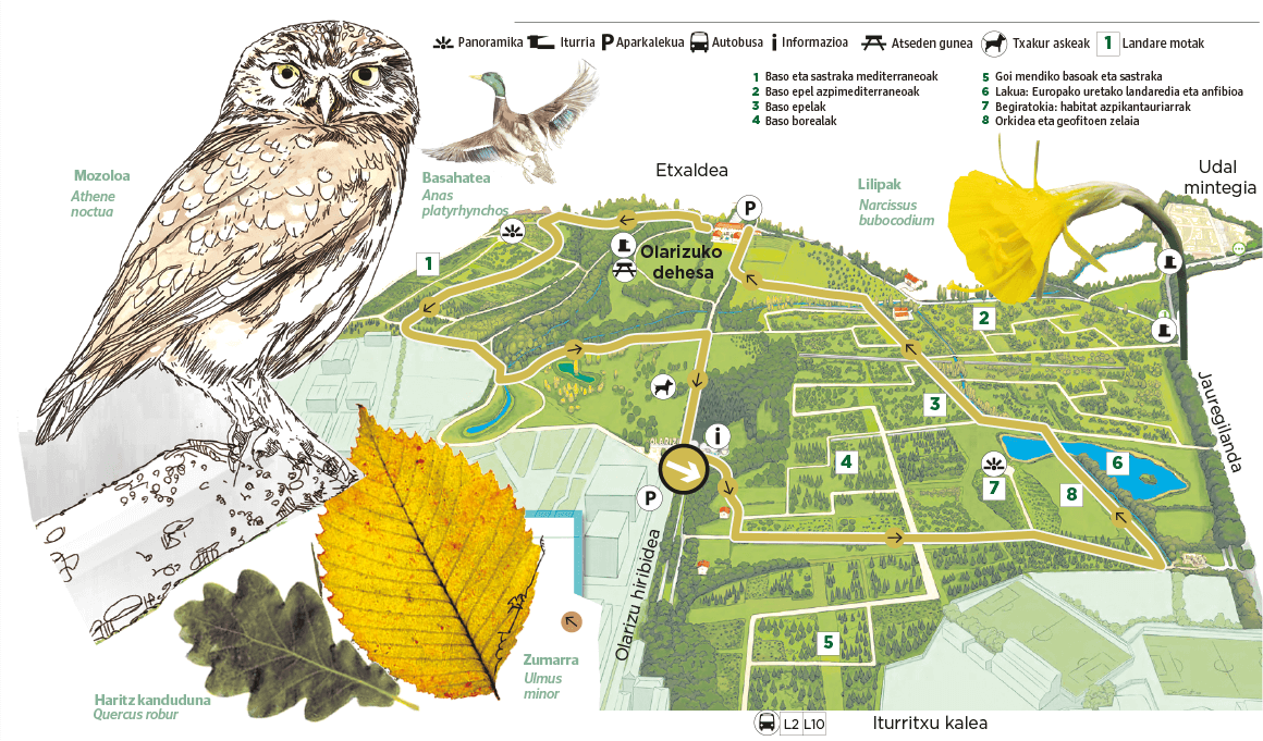 Olarizu erromeria, muinora igotzea eta dehesa da. Eta duela urte batzuetatik hona, Europa osoko botanikariak inbidiatan jarri dituen lorategi handia hazten ari da bertan, ibilbide, zurezko zubi eta laku artean. Erlaxatu kontinente zaharreko baso erakusgarrienetako batean.