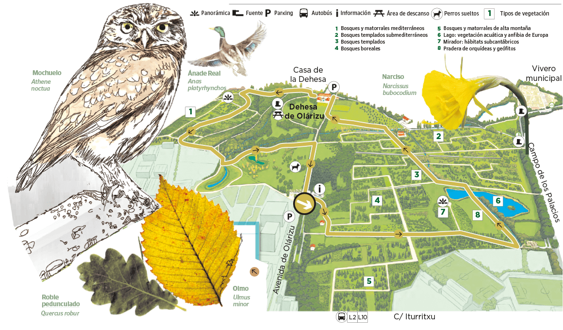 El recorrido comienza en el acceso al Jardín Botánico de Olarizu desde la Avenida Olarizu, junto al letrero de acero que presenta la entrada al jardín. Se toma el camino que pasa por delante del punto de recepción de visitantes o Infogune del Jardín Botánico y que se adentra en el arboreto en dirección oeste.