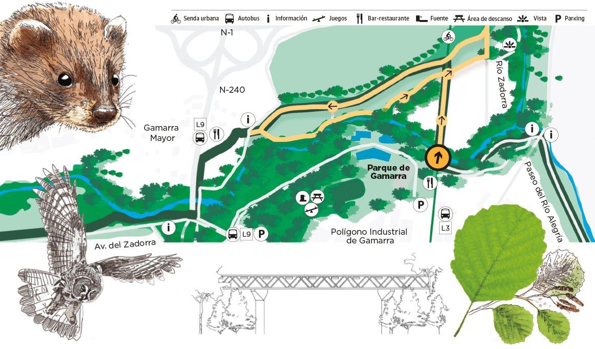 Llegando al pueblo, nuevos paneles y postes informativos nos indican cómo proseguir la Vuelta al Anillo Verde. Podemos seguir la Vuelta y regresar al punto de inicio a través del complejo polideportivo de Gamarra (4) – cuyas instalaciones están abiertas fuera de la temporada de baños– o bien regresar por la margen izquierda del cauce de avenidas hasta la Vía Verde.